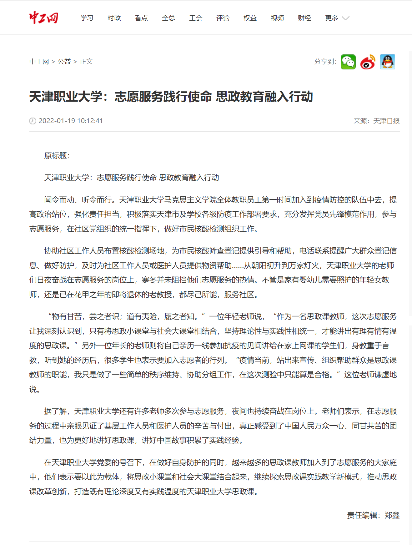 中工網:天津職業大學:志願服務踐行使命 思政教育融入行動