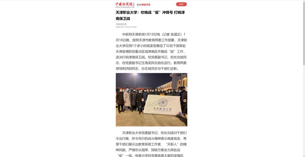 中新網天津新聞1月19日電(記者 張道正)1月18日晚,按照天津市教育兩委工作部署,天津職業大學僅用1個多小時就緊急集結了32名幹部奔赴天津疫情防控重點區域津南區開展戰“疫”工作,堅決打響津南保衛戰。校黨委副書記、校長劉斌同志、校黨委副書記王海龍同志前往送行。教育兩委領導荊洪陽同志、孫志良同志與幹部們合影。